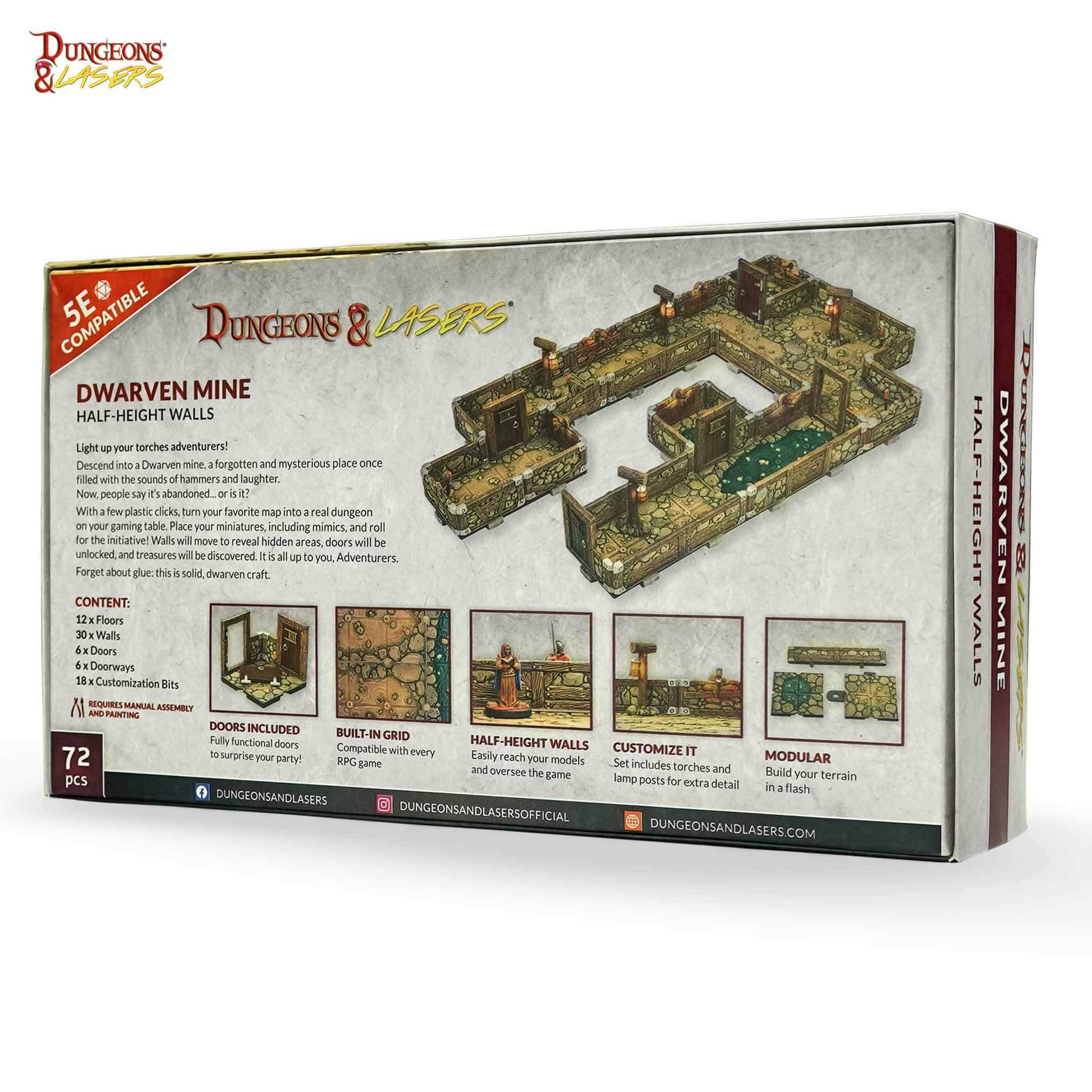 Dungeons & Lasers terrains are manufactured in tabletop scale with 30mm visible grids and 25mm half-height walls.