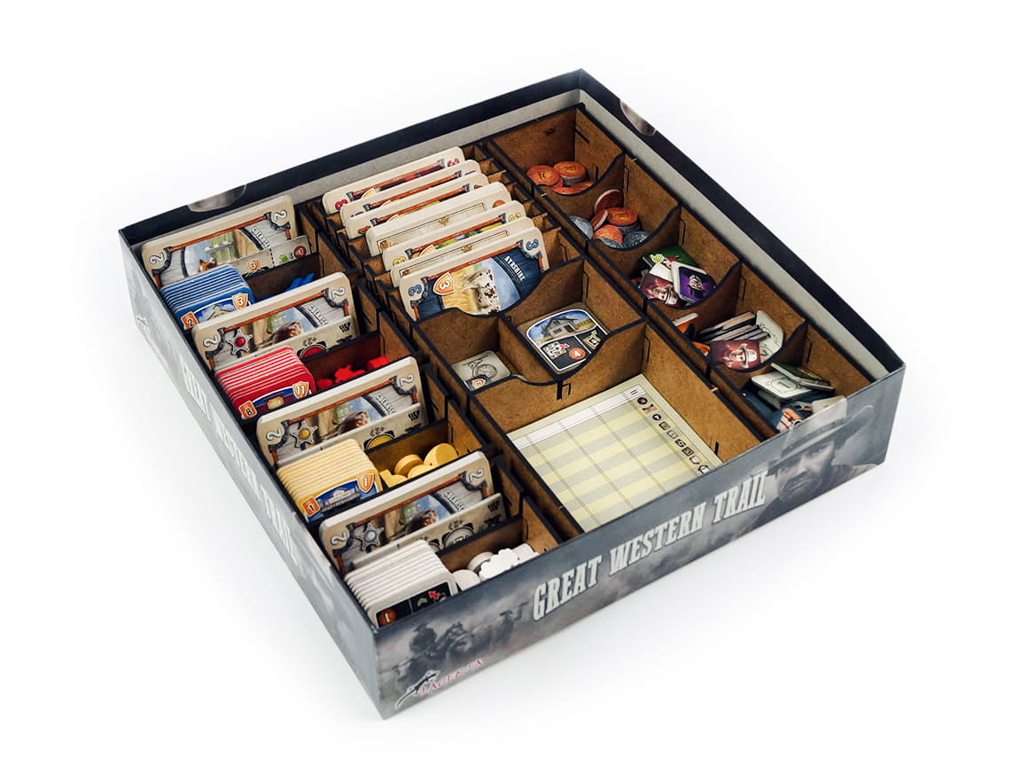 e-Raptor Insert compatible with Great Western Trail + Rails to the North expansion is your must have accessory designed to organize and improve the experience of the gameplay.