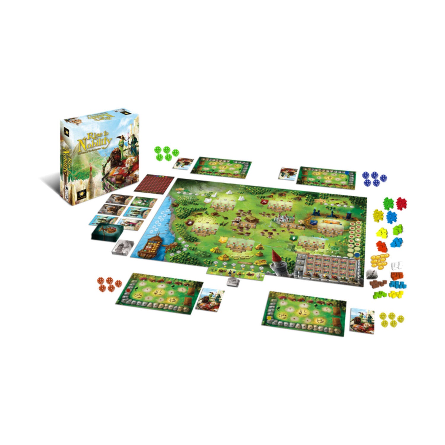 Rise to Nobility is a worker (dice) placement game set in the same fantasy world as Cavern Tavern. You each own a small piece of land in the newly built city, and your job is to rise from anonymity, make your way to the title of lord, and take over the head seat at the Stone Council.
