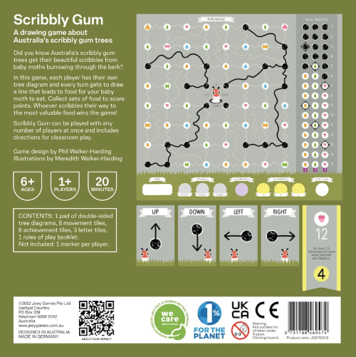 Did you know Australia’s scribbly gum trees get their beautiful scribbles from baby moths burrowing through the bark? In this game, each player has their own tree diagram and every turn gets to draw a line that leads to food for your baby moth to eat. Collect sets of food to score points. Whoever scribbles their way to the most valuable food wins the game! Scribbly Gum can be played with any number of players at once and includes directions for classroom play. Scribbly Gum is a winner of the Major Fun award.