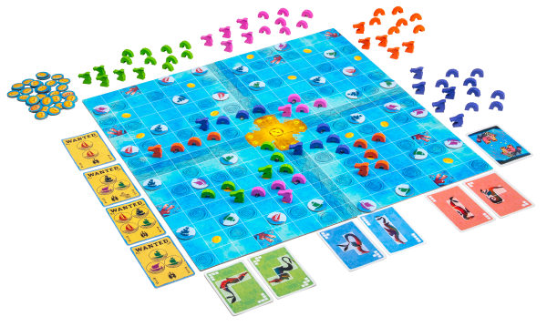 A family game with polyominoes where players take the role of Sea Dragons protecting the ocean from daring pirates and collecting treasures. On your turn, you play a Pattern card from your hand to place a Sea Dragon on the board, increasing your presence on the four Sea Realms. But beware! You won’t be able to place your Sea Dragons next to each other and placing them next to your rivals’ Sea Dragons will grant them benefits. Claim victory by winning the majorities on each of the four Sea Realms, completing missions and collecting treasures.